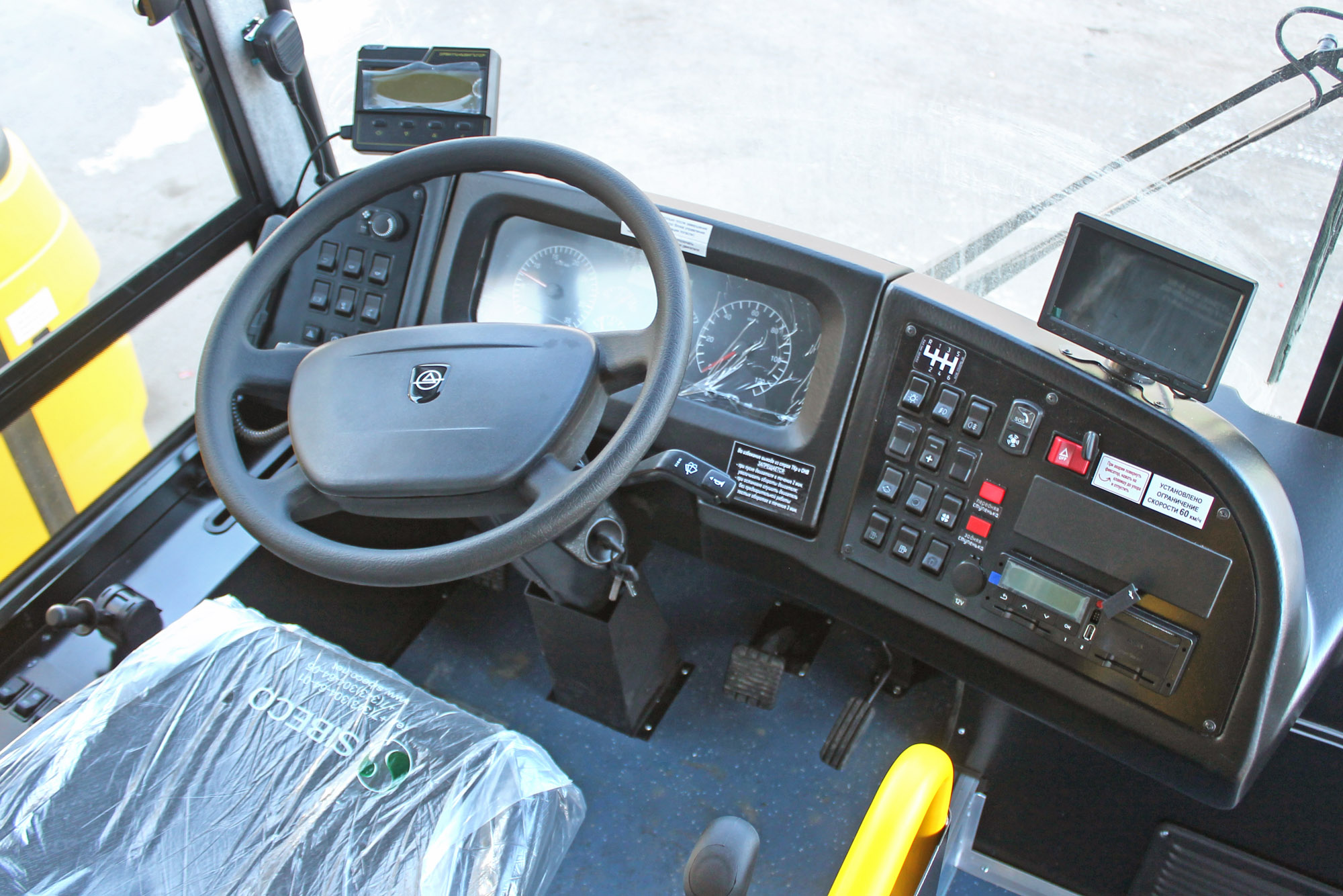 Дополнительная ступенька поможет забраться в автобус даже самым маленьким пассажирам. В салоне каждой машины размещены кнопки экстренной связи с водителем, а рабочее место водителя оборудовано наружной и внутренней громкоговорящей установками. В задней части салона установлены стеллажи для ранцев.